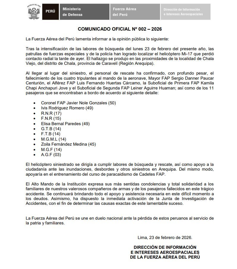 La Fuerza Aérea del Perú confirmó que 15 personas fallecieron tras la caída de un helicóptero MI-17 en Arequipa. Según el comunicado oficial N.° 002–2026, la aeronave fue localizada luego de intensas labores de búsqueda realizadas el lunes 23 de febrero.