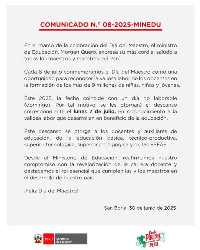 De acuerdo con el Comunicado N°08-2025-MINEDU, se da a conocer que en el marco de la celebración del Día del Maestro, el titular de la cartera de Educación, Morgan Quero, expresa un cordial saludo a todos los maestros y maestras del Perú para dar a conocer lo siguiente: