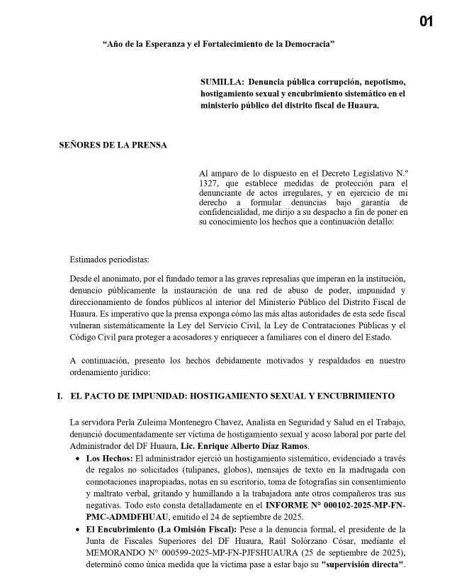 De acuerdo con el documento, uno de los hechos más delicados corresponde a un presunto caso de hostigamiento sexual sistemático atribuido al administrador Enrique Alberto Díaz Ramos contra una trabajadora de la institución. La denuncia sostiene que esta situación habría sido encubierta por el presidente de la Junta de Fiscales Superiores, Raúl Solórzano Cosar, quien según el escrito no habría dispuesto el apartamiento del funcionario ni iniciado el correspondiente procedimiento disciplinario.