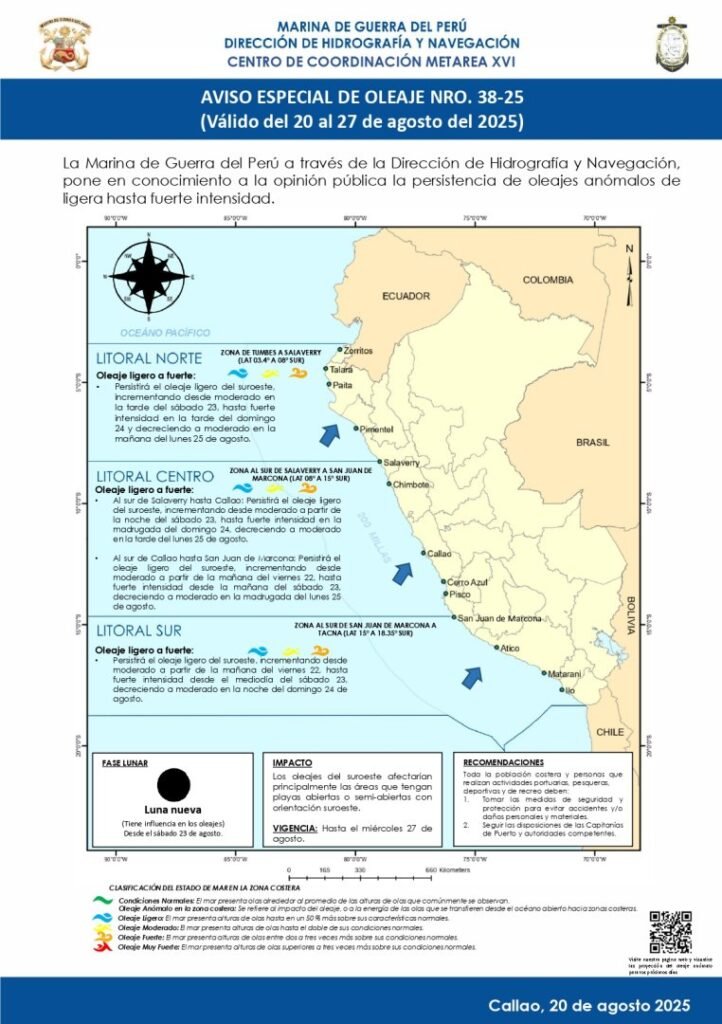 De acuerdo con las estimaciones de la DHN, en el litoral norte – de Tumbes hasta Salaverry – el arribo del oleaje ligero se registró desde la tarde del sábado 23 de agosto del 2025. Asimismo, hasta este domingo 24 el nivel será fuerte, decreciendo a moderado a partir de la mañana del lunes 25 de agosto.