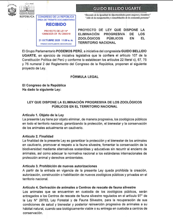 En ese sentido, el Proyecto de Ley N.º 12909/2025-CR, presentado el martes 21 de octubre, a través de la plataforma institucional del Congreso, puntualiza que su finalidad es promover el respeto a la fauna silvestre, fomentar la conservación de la biodiversidad mediante alternativas sostenibles y educativas sin recurrir al encierro de animales, así como adecuar la normativa nacional a los estándares internacionales de protección animal y derechos ambientales.