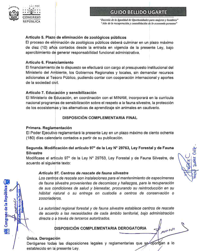 De acuerdo con el texto del también expresidente del Consejo de Ministros, si su proyecto de ley es aprobado por el Pleno del Congreso, queda prohibida la creación, autorización, construcción o habilitación de nuevos zoológicos públicos y privados en todo el Perú.