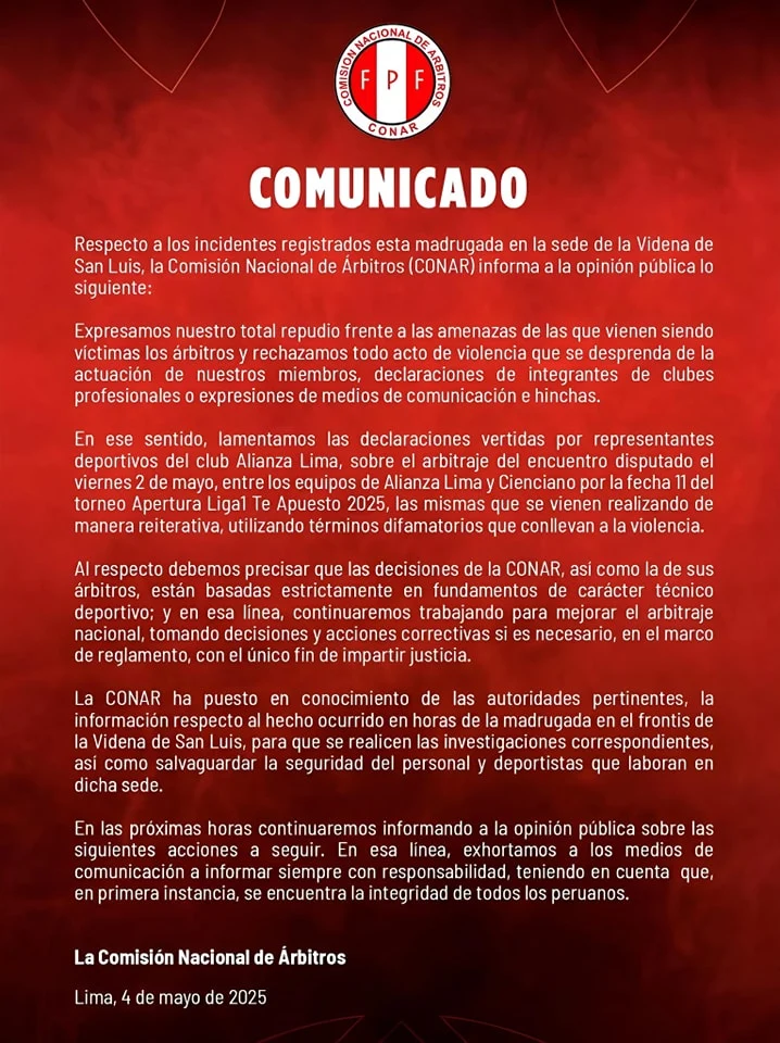 La Comisión Nacional de Árbitros (Conar) se pronunció a través de un comunicado luego de las amenazas de muerte a los árbitros que desconocidos dejaron la mañana de este domingo 4 de mayo en la Videna. Además de condenar el ataque, el organismo lamentó las declaraciones que representantes de Alianza Lima han venido realizando acerca de la labor de los réferis, las cuales consideraron que «conllevan a la violencia».