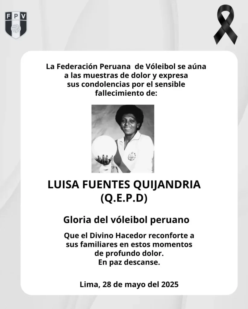 El deporte peruano está de luto luego que la Federación Peruana de Voleibol diera a conocer la noticia del sensible fallecimiento de Lucha Fuentes Quijandría, una de las máximas exponentes de la historia de este deporte en nuestro país.