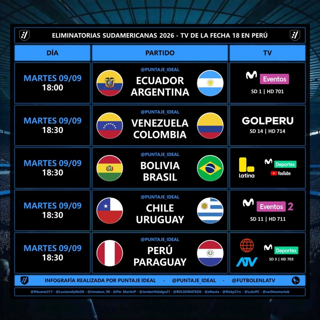 Con seis selecciones clasificadas al Mundial 2026 y con Bolivia y Venezuela luchando por el repechaje, la última fecha de las eliminatorias sudamericana se juega este martes 9 de setiembre, en el que sus cinco partidos se transmitirá en directo en todo el Perú