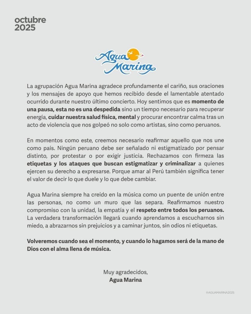 Los integrantes de Agua Marina, que ya fueron dados de alta y se encuentran estables, afirmaron que buscan reencontrarse con la tranquilidad antes de volver a los escenarios. “Procurar encontrar calma tras un acto de violencia que nos golpeó no solo como artistas, sino como peruanos”, mencionan en el documento.