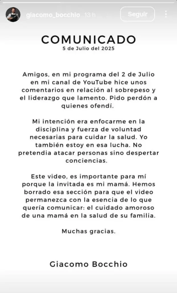 Giacomo Bocchio se pronunció la noche del 5 de julio a través de un comunicado en sus redes sociales. En el mensaje, el chef reconoció que sus palabras no fueron adecuadas y ofreció disculpas a quienes se sintieron ofendidos: “Amigos, en mi programa del 2 de julio en mi canal de YouTube hice unos comentarios en relación al sobrepeso y el liderazgo que lamento. Pido perdón a quienes ofendí”, escribió.