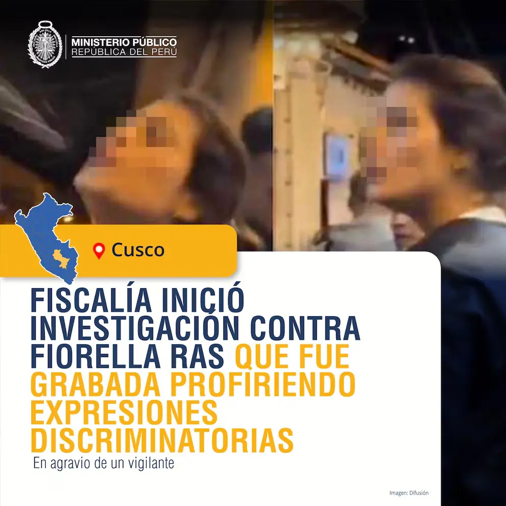 La Fiscalía Penal Supraprovincial Especializada en Derechos Humanos e Interculturalidad de Cuzco ha iniciado una investigación preliminar contra la ciudadana piurana Fiorella Elisa Ras Viani por presunto delito de discriminación o incitación a la discriminación, La decisión fue tomada de oficio por el fiscal provincial Eduardo Alatrista Aguilar, tras conocer varias publicaciones en redes sociales que muestran a Ras protagonizando un altercado el 21 de abril.