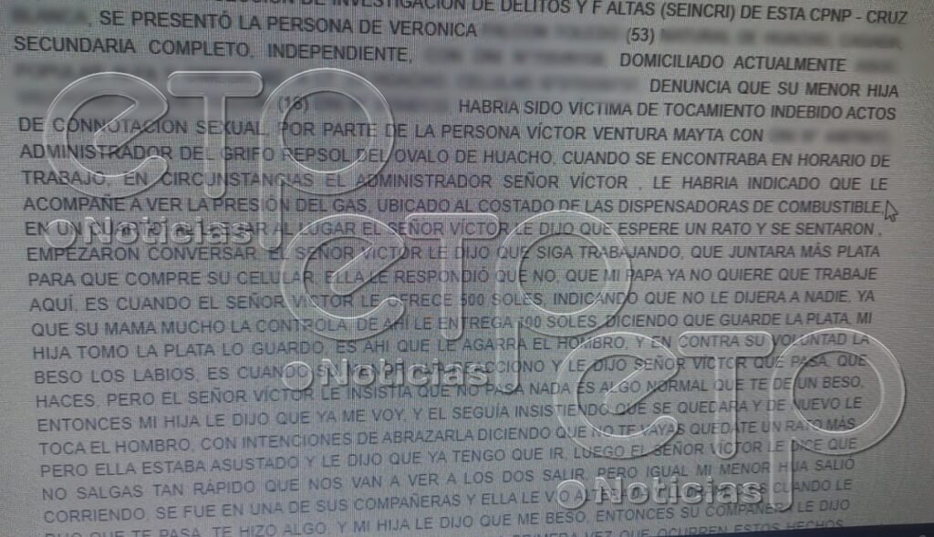 Una madre denunció ante la Comisaría de Huacho al administrador de un grifo Repsol, identificado como Víctor Ventura Mayta, por presuntos tocamientos indebidos contra su hija de 16 años. Los hechos habrían ocurrido durante el horario laboral del denunciado.