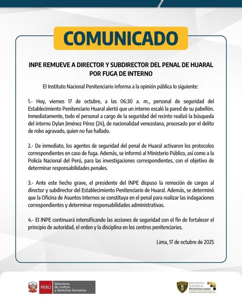 Debido a la gravedad del caso, el presidente del INPE ordenó la destitución del director y subdirector del establecimiento penitenciario de Huaral. Asimismo, se dispuso que la Oficina de Asuntos Internos se constituya en el penal para realizar las investigaciones administrativas.