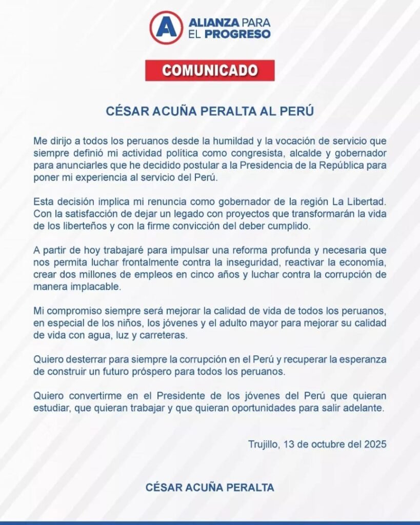 César Acuña anunció este lunes 13 de octubre que dejará de ser gobernador regional de La Libertad, a través de un pronunciamiento difundido por los canales oficiales del partido político que lidera.