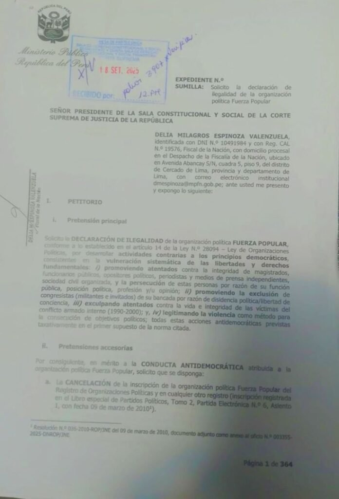La fiscal de la nación, Delia Espinoza Valenzuela, solicitó al Poder Judicial la cancelación de la inscripción del partido político Fuerza Popular por presunta «conducta antidemocrática».