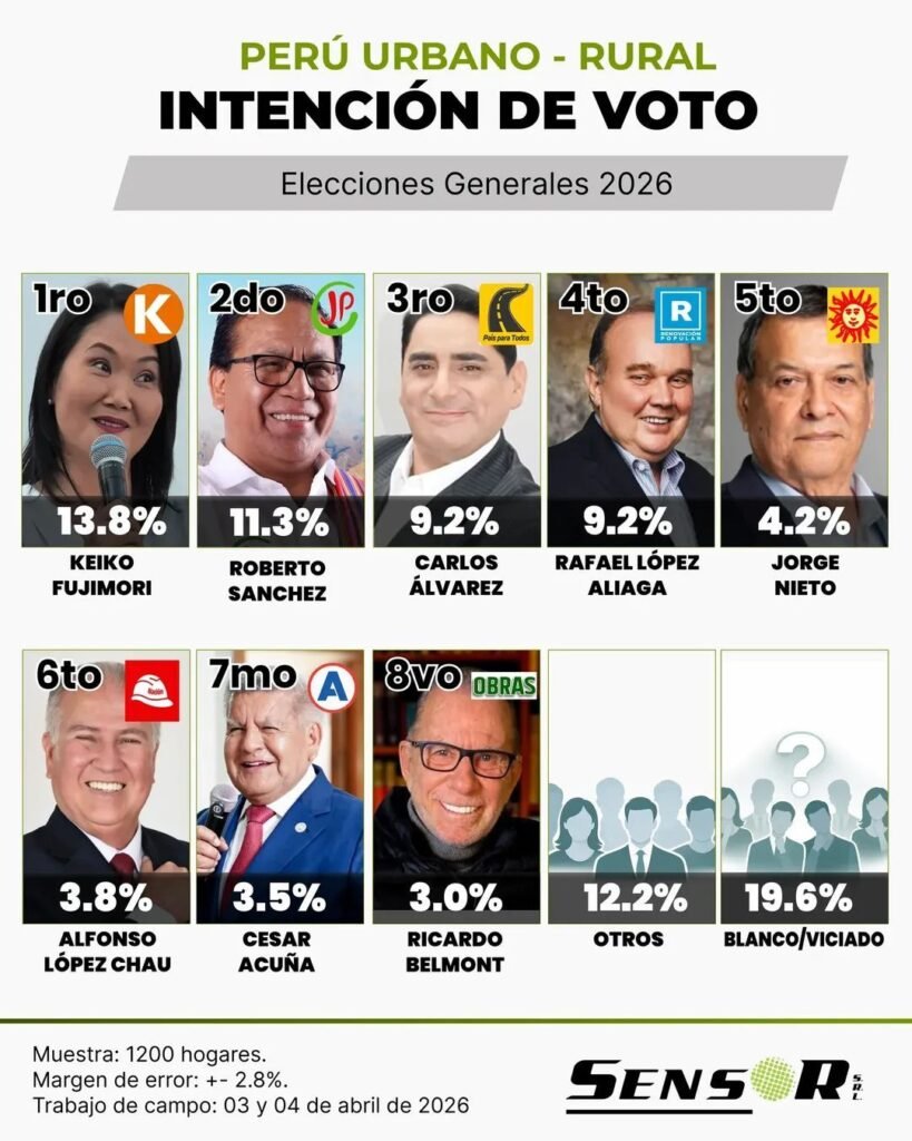 A una semana de las elecciones generales del 12 de abril de 2026, el escenario presidencial peruano muestra un campo fragmentado, volátil y sin un líder que consolide mayoría. Este análisis de intención de voto de alcance nacional urbano-rural, elaborado sobre una muestra de 1,200 electores en las cinco macro regiones del país, revela tendencias que van más allá de los números: un electorado dividido entre la costa y el interior, entre lo urbano y lo rural, entre la política conocida y la búsqueda de nuevas opciones. ¿Quién llega fuerte a la recta final? ¿Dónde están los votos que aún no tienen dueño? Los datos de abril 2026 ofrecen las respuestas más actualizadas antes del silencio estadístico obligatorio que rige desde el 6 de abril.